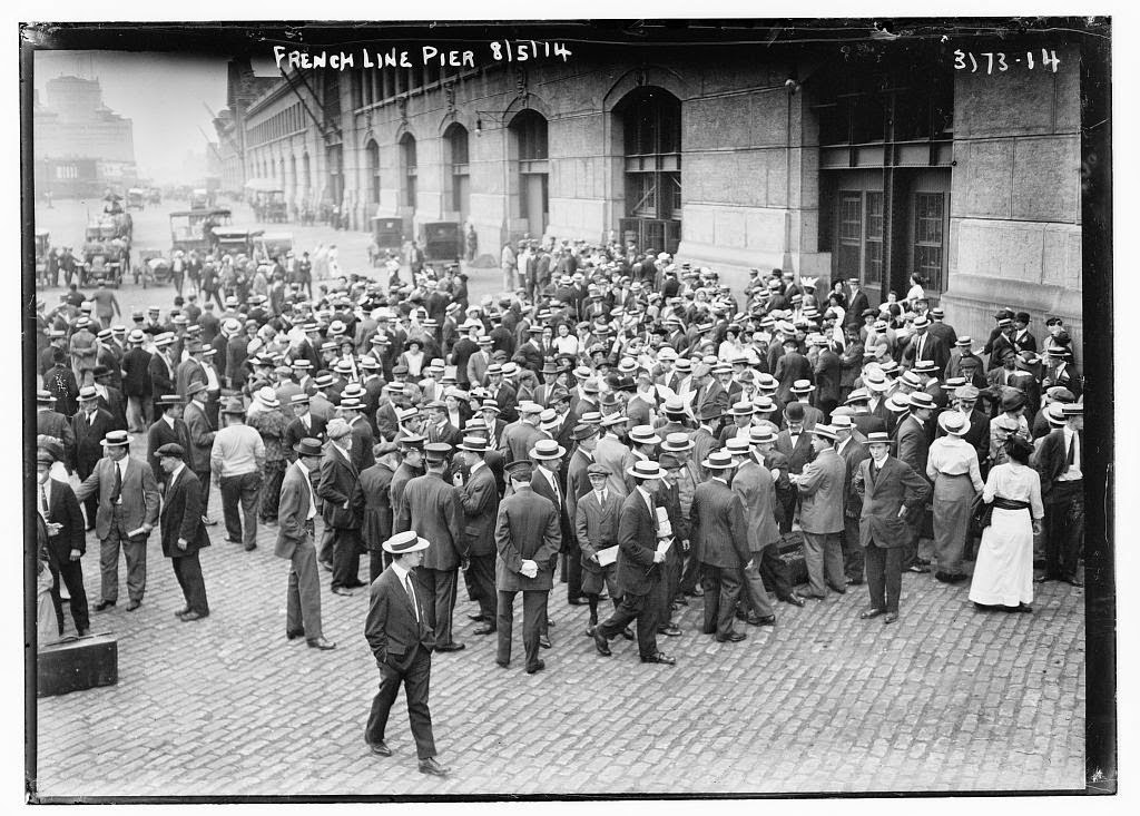 French and American volunteers crowd together while waiting in New York while waiting for their ship to take them to France August 5, 1914