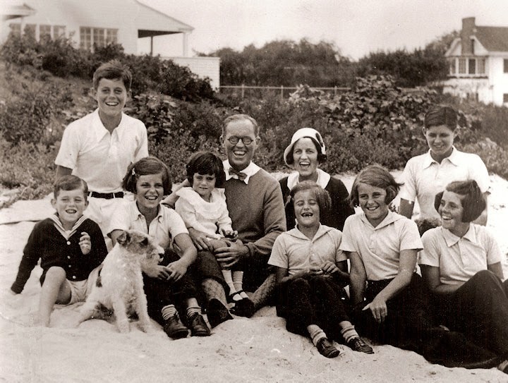 | 1931 family portrait at Hyannis Port. Left to Right: Bobby, Jack, Eunice, Jean, Joseph Sr., Rose with Pat in front of her, Kathleen, Joe junior, and Rosemary. |